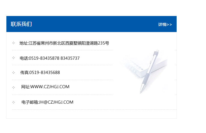 地址:常州市新北區友邦商務大廈1幢16、17層  電話:0519-85101652  傳真:0519-85112595  郵編:213022  網址:www.cz-jiayue_cn.lbjxy.com  郵箱:xiajifengaa@163.com
